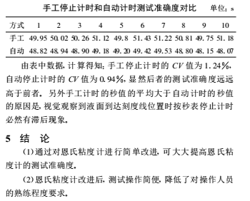 恩氏粘度計(jì)采用人工卡秒表的方式計(jì)時(shí), 這樣就存在人為的操作誤差。 另外, 操作人員需用肉眼監(jiān)視量瓶中流入漿液的液面是否到達(dá)刻度線位置, 以停止秒表計(jì)時(shí) , 這也勢(shì)必存在著視覺(jué)誤差。 操作誤差和視覺(jué)誤差必然導(dǎo)致其測(cè)試準(zhǔn)確度低。為盡量減小這些誤差, 操作人員需經(jīng)過(guò)長(zhǎng)期訓(xùn)練, 而且**好能長(zhǎng)期固定檢驗(yàn)人員, 不同檢驗(yàn)人員測(cè)得的數(shù)據(jù)的可比性較差。3 提高恩氏粘度計(jì)測(cè)試準(zhǔn)確度的措施