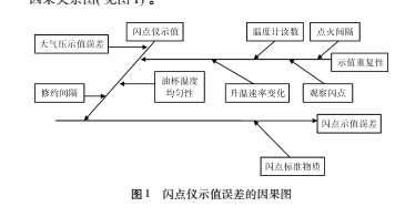的過程中,大氣壓的示值誤差、油杯溫度均勻性、修約間隔以及重復(fù)性測(cè)量都會(huì)對(duì)閃點(diǎn)儀的示值產(chǎn)生影響,其中,升溫速率變化、氣壓變化、溫度計(jì)的讀數(shù)、觀察閃點(diǎn)、點(diǎn)火間隔都會(huì)對(duì)示值的重復(fù)性產(chǎn)生影響,其中,在實(shí)驗(yàn)過程中,大氣壓變化較小,對(duì)測(cè)量結(jié)果影響可以忽略不計(jì)。現(xiàn)根據(jù)各不確定分量繪制因果關(guān)系圖( 見圖 1) 。
