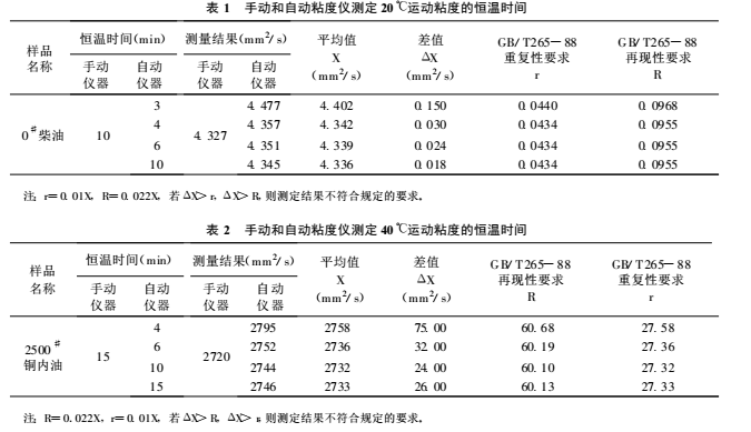 自動粘度儀取樣量的多少取決于油品粘度的大小,粘度越大取樣量越小 ,這與 GB/T265 -88 規定的取樣量正好相反 , 取樣量的不同將影響油品在浴中的恒溫時間, 所以對自動粘度儀測定不同溫度下油品的恒溫時間與G標(手動粘度儀)中的規定進行了比較,以便找出適合自動粘度儀的操作條件 ,其中手動粘度儀的恒溫時間均為G標規定 , 實驗結果如表 1 、表 2 、表 3 所示。